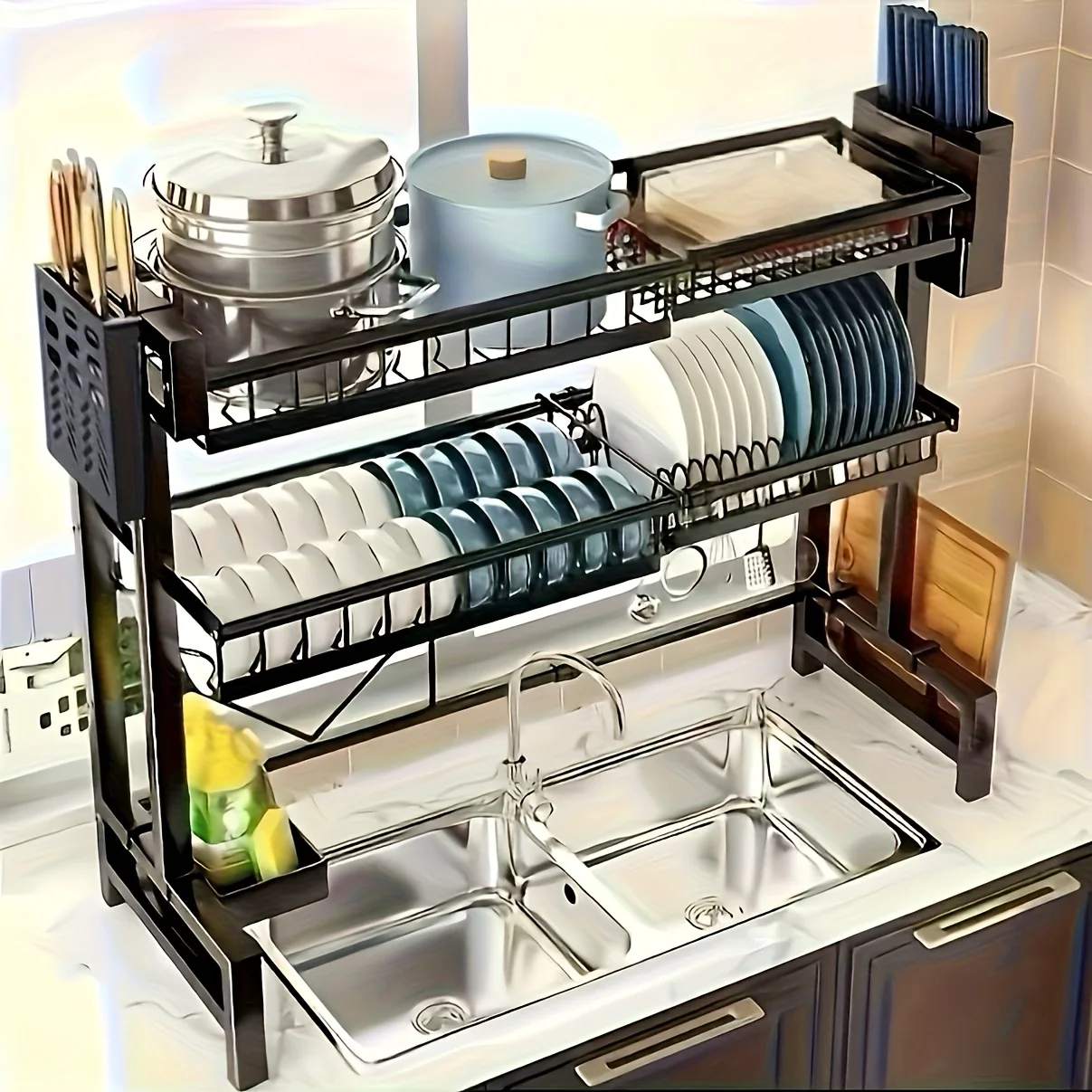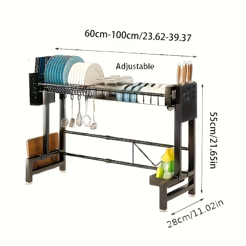 1 adjustable black metal kitchen rack with sink and lid -2-layer expandable dishwasher rack with cutlery rack.