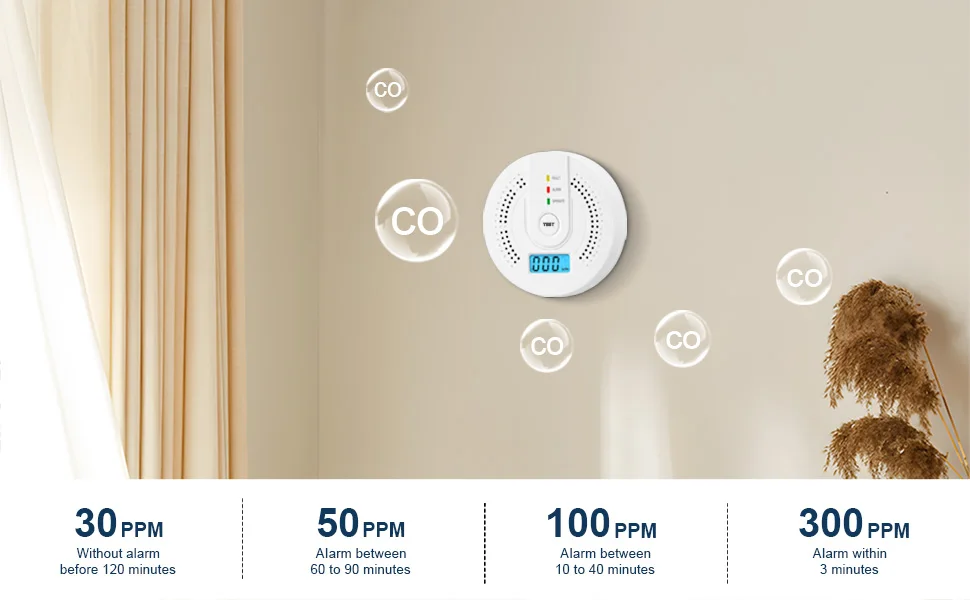 1.Alarm Standard: Alarm at different levels of carbon monoxide concentration, <50 PPM, no alert, LCD display concentration; 50 PPM-100 PPM, alert within 80 minutes; 100 PPM-300 PPM, alert within 30 minutes; 300 PPM, alert within 3 minutes