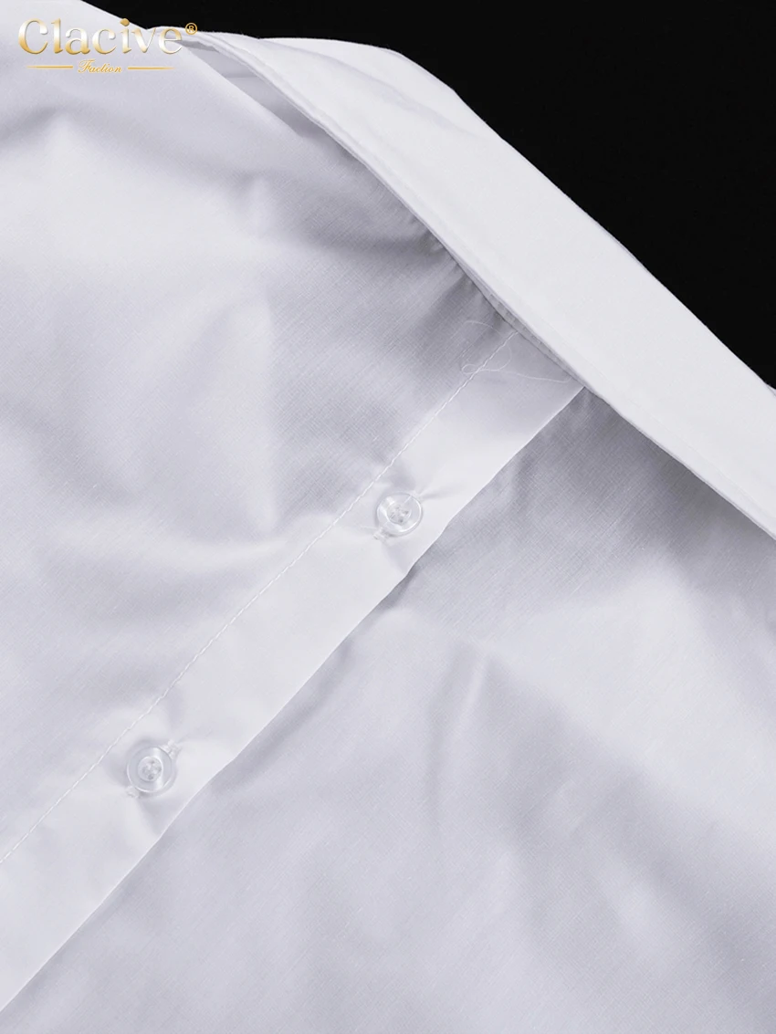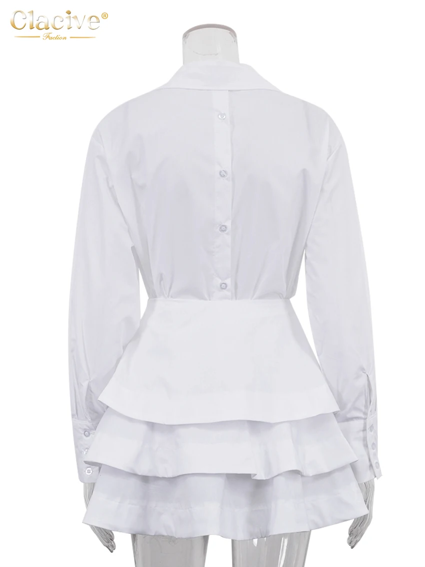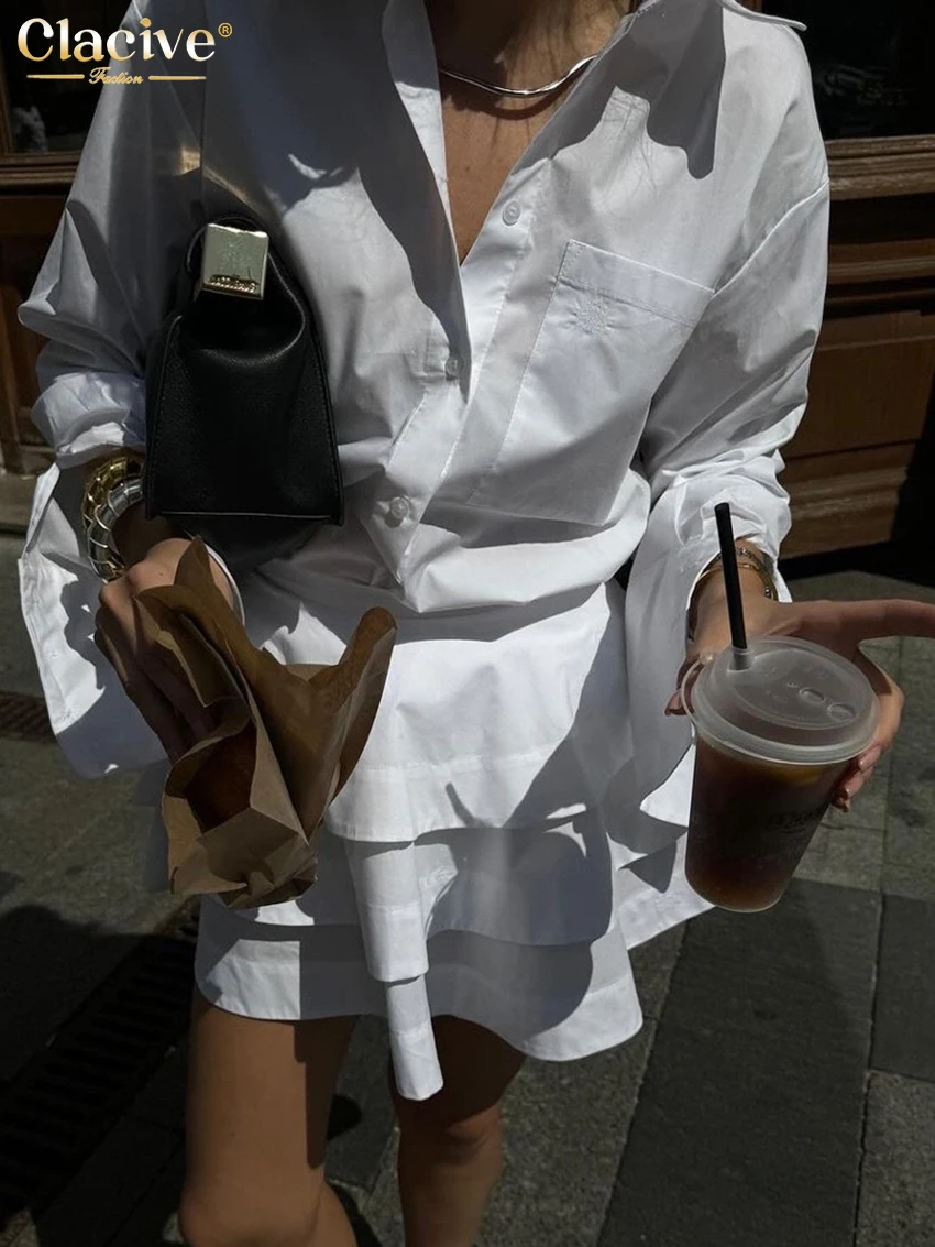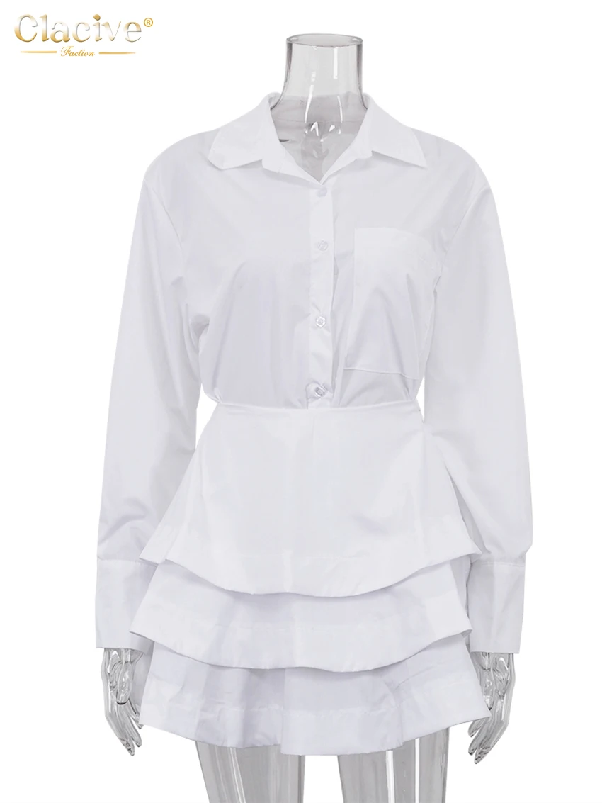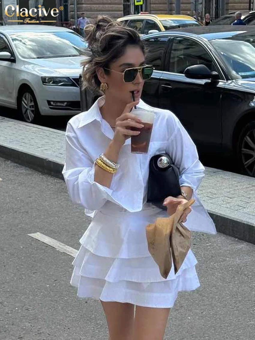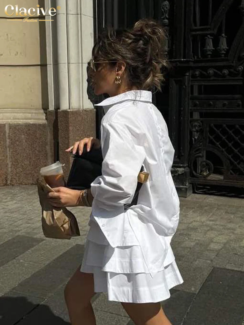 Clacive Fashion Loose White Cotton Women's Two Pieces Set 2025 Elegant Long Sleeve Shirt With High Waist Pleated Mini Skirt Set