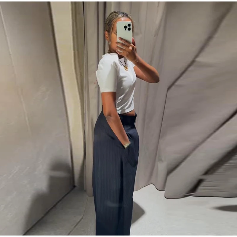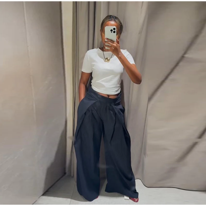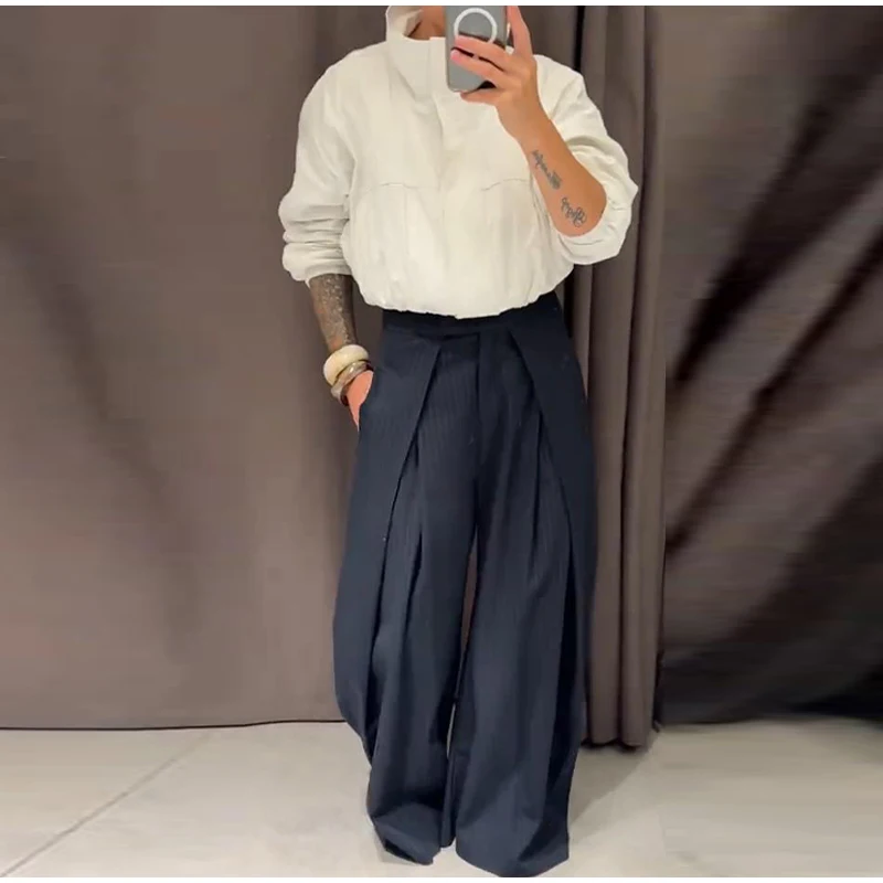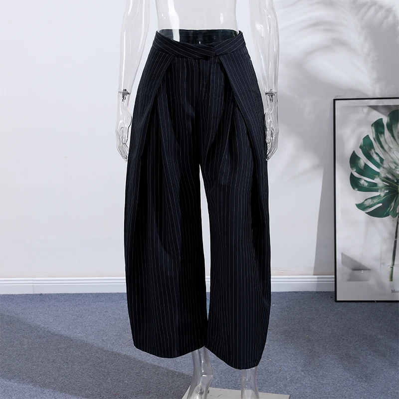 Fashion Stripe Pleated Wide Leg Pants For Women Casual Pockets High Waist Long Trousers 2025 Autumn New Lady Pants High Street