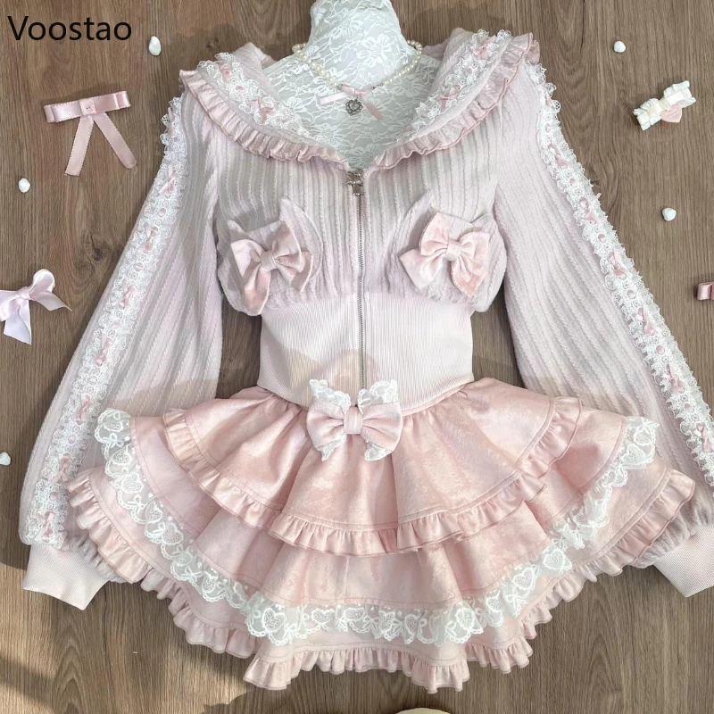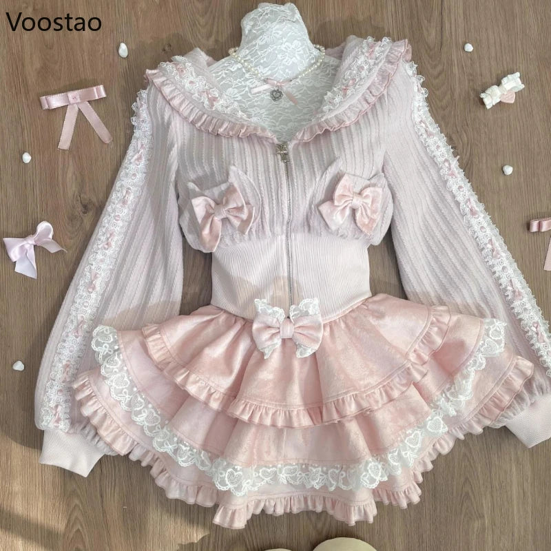 Kawaii Lolita Style Women 2 Piece Set Japanese Sweet Pink Bow Zipper Coat Tops Lace Ruffle Mini Cake Skirt Female Fashion Outfit
