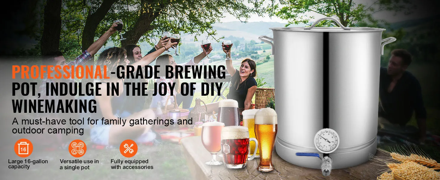 Professional Brewing Equipment: This home brew kettle set is equipped with a stainless-steel brewing pot, thermometer, ball valve, and other small beer brewing accessories, making it suitable for crafting a variety of beers. From smooth ales to delicious porters and hopped beers, it's the first choice for brewing enthusiasts. With a large 16-gallon capacity, this brew pot is ideal for home beer brewing, cooking, boiling water, dyeing fabrics, or any activity that requires a large volume. Delight in the pleasure that flavor brings.