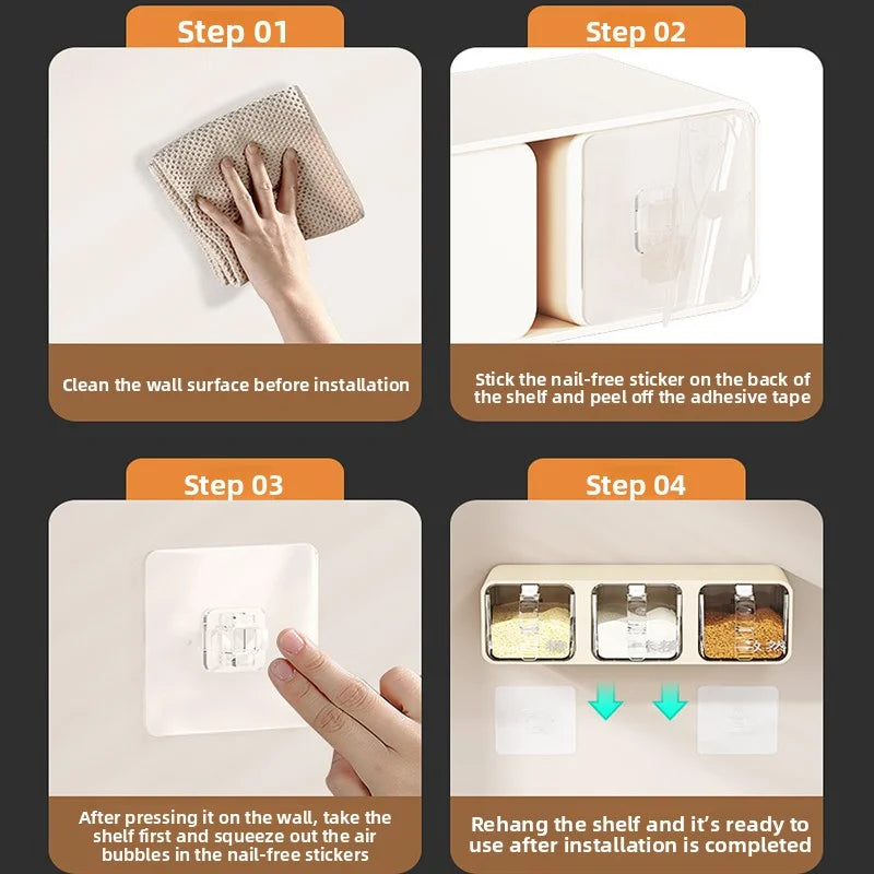 Wall-mounted moisture-proof seasoning box for home kitchen with condiment bottles for salt, MSG, and other condiments.